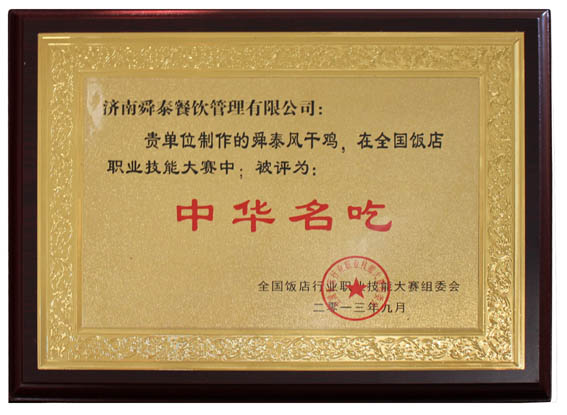 我公司的舜泰风干鸡被评为“中华名吃”